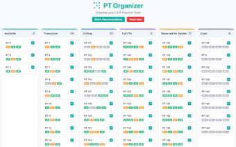 ตัวจัดระเบียบการทดสอบ LSAT เป็นส่วนขยาย Chrome ฟรีที่ออกแบบมาเพื่อเพิ่มประสิทธิภาพในการเตรียมตัวสำหรับ LSAT มันช่วยให้ผู้ใช้สามารถจัดการการทดสอบฝึกหัด (PTs) ของตนได้อย่างเป็นระบบในหกหมวดหมู่ รวมถึง Available, Translation, Drilling, Full Tests, Reserved for Retake, และ Used ด้วยอินเทอร์เฟซที่ใช้งานง่ายแบบลากและวาง และฟีเจอร์การติดตามที่มองเห็นได้ เครื่องมือนี้ช่วยให้นักเรียนสามารถจัดระเบียบวัสดุของตนได้อย่างมีประสิทธิภาพและติดตามความก้าวหน้าของพวกเขา นอกจากนี้ยังมีระบบการจัดระเบียบที่ได้รับการสนับสนุนจากผู้เชี่ยวชาญซึ่งอิงจากกลยุทธ์ LSAT ที่พิสูจน์แล้ว เพื่อให้แน่ใจว่าการจัดสรรการทดสอบฝึกหัดในช่วงการศึกษาเป็นไปอย่างเหมาะสม